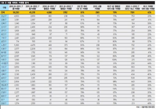 그럼 구체적으로 들여다보자. 7월 31일 기준 과거 1년간(2011년 8월~2012년 7월) 서울 소재 아파트 거래량은 4만5378건으로, 그 전 1년간(2010년 8월~2011년 7월) 거래량(5만6230건)의 81% 수준을 기록했다(<표 1> 참조).